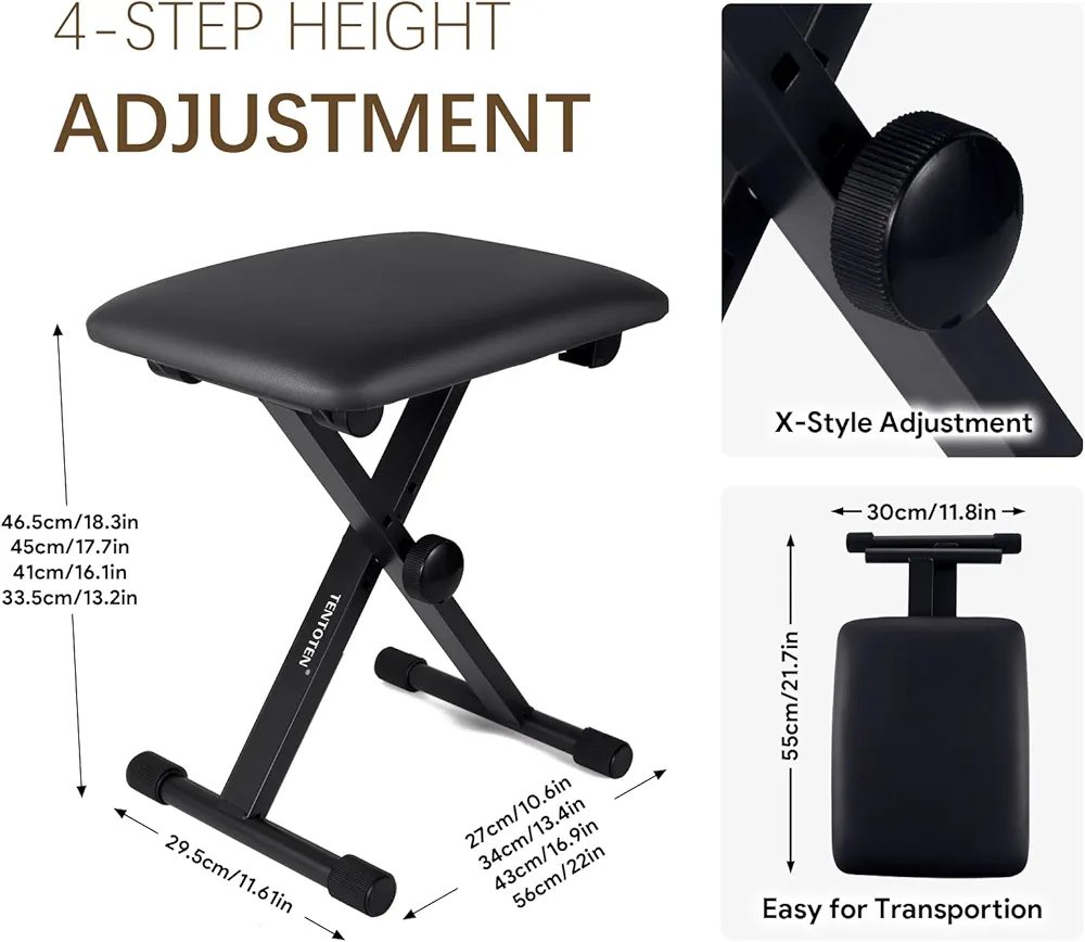 EASY TO INSTALL:The keyboard bench adpots X-style design. Very easy to install and adjust the height. Range of height 13.2-18.3 inches. Meet your different needs.